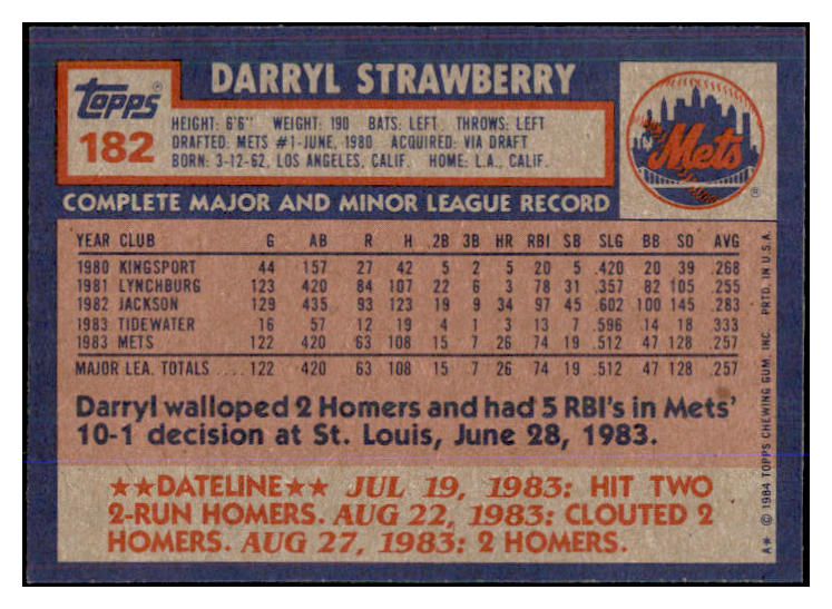 1984 Topps #182 Darryl Strawberry Mets NR-MT 537758