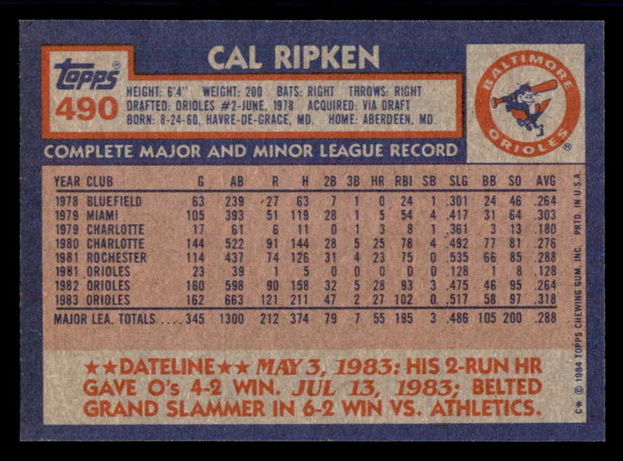 1984 Topps #490 Cal Ripken Orioles NR-MT 543238