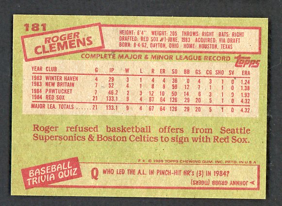 1985 Topps #181 Roger Clemens Red Sox NR-MT 537781