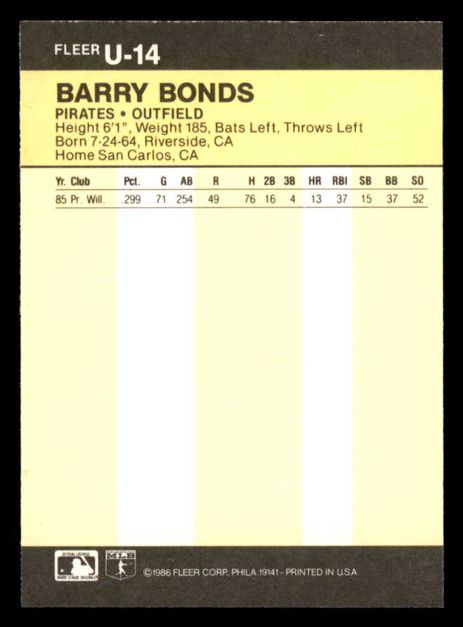 1986 Fleer Update #014 Barry Bonds Pirates EX-MT 547186