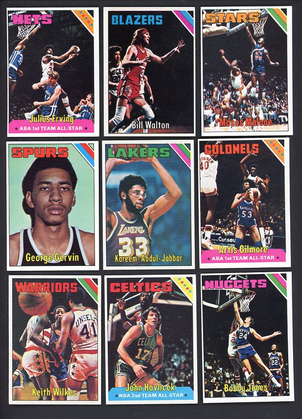 1975-76 Topps Basketball near set (missing McAdoo, Issel, 8 commons). Nice condition overall - mainly EX-MT (or close to it) with minimal corner wear, no creasing, normal centering, small number a bit less. Includes Jabbar EX-MT/NR-MT, Malone rookie EX+/EX-MT oc, Erving EX-MT oc, Walton rookie EX-MT, Wilkes rookie EX+/EX-MT, Jones rookie EX+/EX-MT, Gervin EX-MT, Havlicek EX+/EX-MT, etc. Buy with confidence. We are the oldest full-time dealer in America, serving collectors since 1976. ALL CARDS ARE SUBJECT TO YOUR APPROVAL. If you ever receive anything that is unsatisfactory you may return it for replacement or full refund. The card pictured is the actual card you will receive. For orders or assistance, call our Toll Free number 888-548-9686 weekdays 8-6 Pacific.