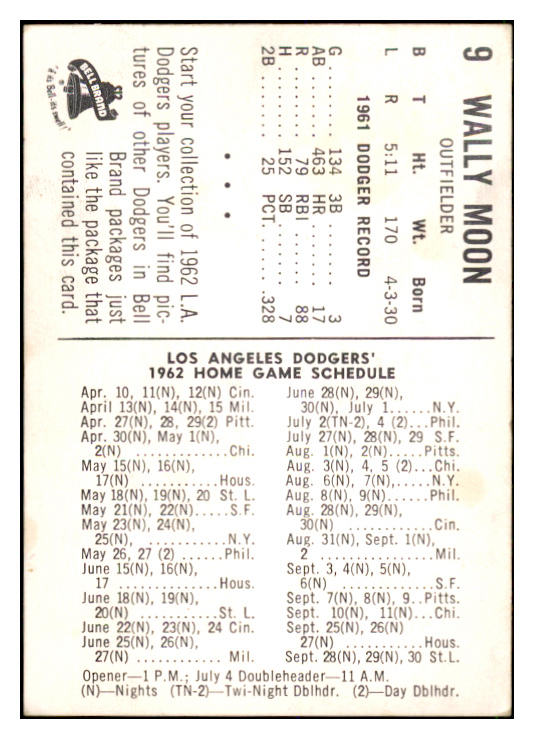 1962 Bell Brand #009 Wally Moon Dodgers EX 537365