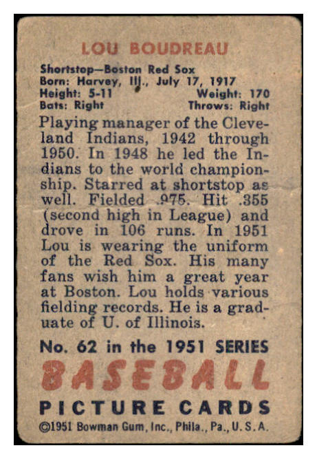 1951 Bowman Baseball #062 Lou Boudreau Red Sox Fair 533846