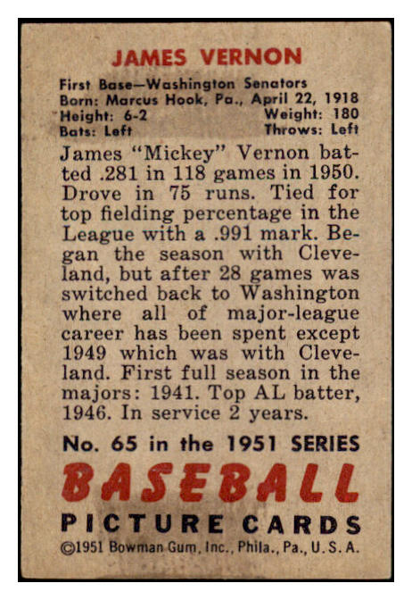 1951 Bowman Baseball #065 Mickey Vernon Senators EX 530838