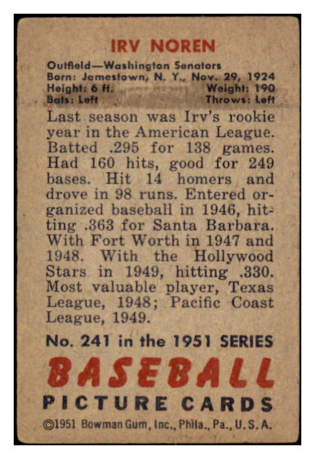 1951 Bowman Baseball #241 Irv Noren Senators VG-EX 489607