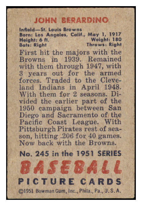 1951 Bowman Baseball #245 John Berardino Browns VG-EX 530827