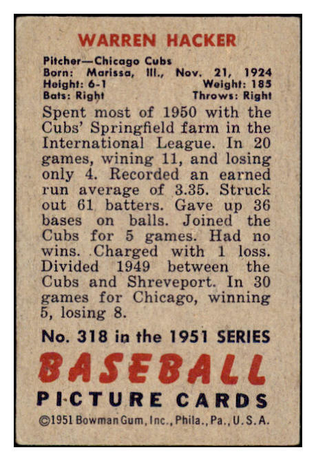 1951 Bowman Baseball #318 Warren Hacker Cubs EX 530888