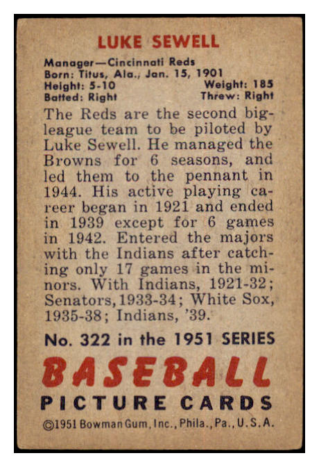 1951 Bowman Baseball #322 Luke Sewell Reds EX 530808