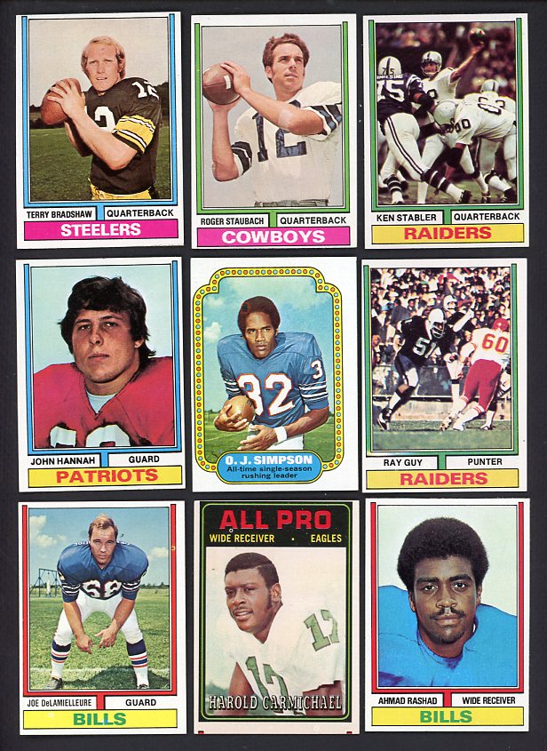 1974 Topps Football complete set in EX-MT condition overall. There are a large number of cards #1-127 well off center; cards #128-528 mostly well centered. Includes Bradshaw EX-MT/NR-MT, Carmichael rookie EX-MT oc, Rashad rookie EX-MT, Delamielleure rookie EX-MT/NR-MT oc, Guy rookie EX-MT, Simpson #1 EX-MT/NR-MT oc, Hannah rookie EX-MT/NR-MT, Stabler EX-MT/NR-MT, Staubach VG-EX light crease, etc. Buy with confidence. We are the oldest full-time dealer in America, serving collectors since 1976. ALL CARDS ARE SUBJECT TO YOUR APPROVAL. If you ever receive anything that is unsatisfactory you may return it for replacement or full refund. The card pictured is the actual card you will receive. For orders or assistance, call our Toll Free number 888-548-9686 weekdays 8-6 Pacific.