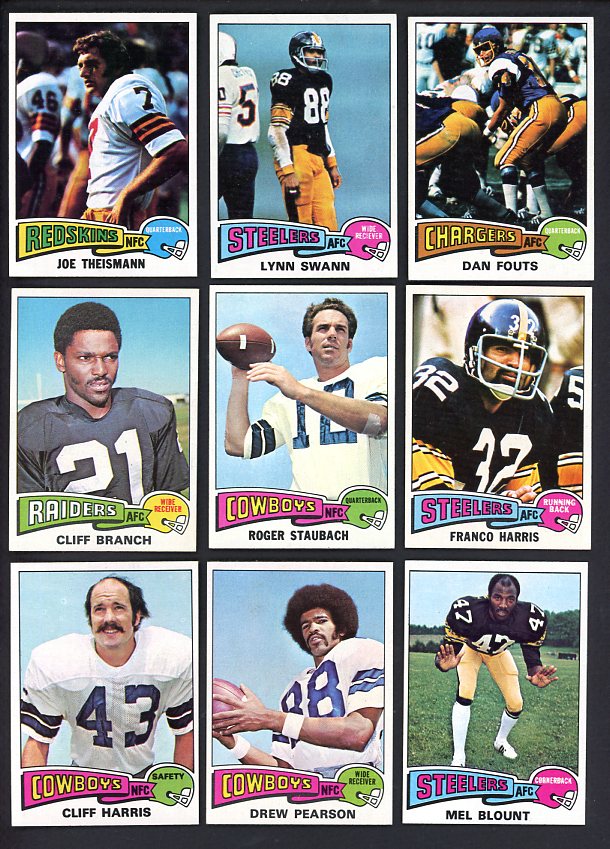 1975 Topps Football complete set in EX-MT/NR-MT condition overall (some less). Includes Fouts rookie EX-MT, Swann rookie EX-MT/NR-MT, Theismann rookie EX-MT/NR-MT, D. Pearson rookie EX-MT, Blount rookie EX-MT, Staubach EX-MT/NR-MT, F. Harris EX-MT/NR-MT, C. Harris rookie EX-MT/NR-MT, Branch rookie EX-MT/NR-MT, etc. Buy with confidence. We are the oldest full-time dealer in America, serving collectors since 1976. ALL CARDS ARE SUBJECT TO YOUR APPROVAL. If you ever receive anything that is unsatisfactory you may return it for replacement or full refund. The card pictured is the actual card you will receive. For orders or assistance, call our Toll Free number 888-548-9686 weekdays 8-6 Pacific.