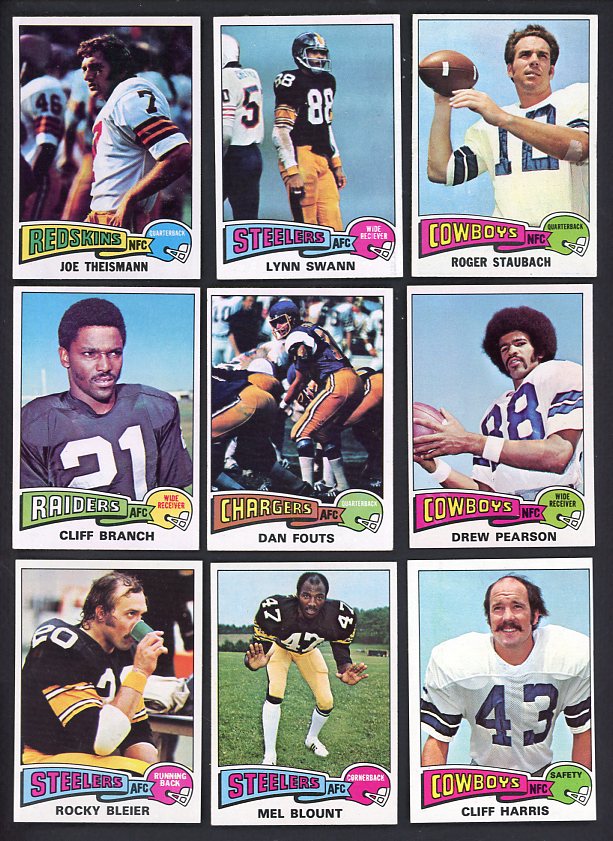 1975 Topps Football complete set in EX-MT condition overall (some better/less). Includes Swann rookie EX-MT, Fouts rookie EX+/EX-MT, Theismann rookie EX-MT/NR-MT, C. Harris rookie EX-MT, Branch rookie EX-MT, Blount rookie EX, Bleier rookie EX-MT/NR-MT, D. Pearson rookie EX-MT, Staubach EX-MT/NR-MT, etc. Buy with confidence. We are the oldest full-time dealer in America, serving collectors since 1976. ALL CARDS ARE SUBJECT TO YOUR APPROVAL. If you ever receive anything that is unsatisfactory you may return it for replacement or full refund. The card pictured is the actual card you will receive. For orders or assistance, call our Toll Free number 888-548-9686 weekdays 8-6 Pacific.
