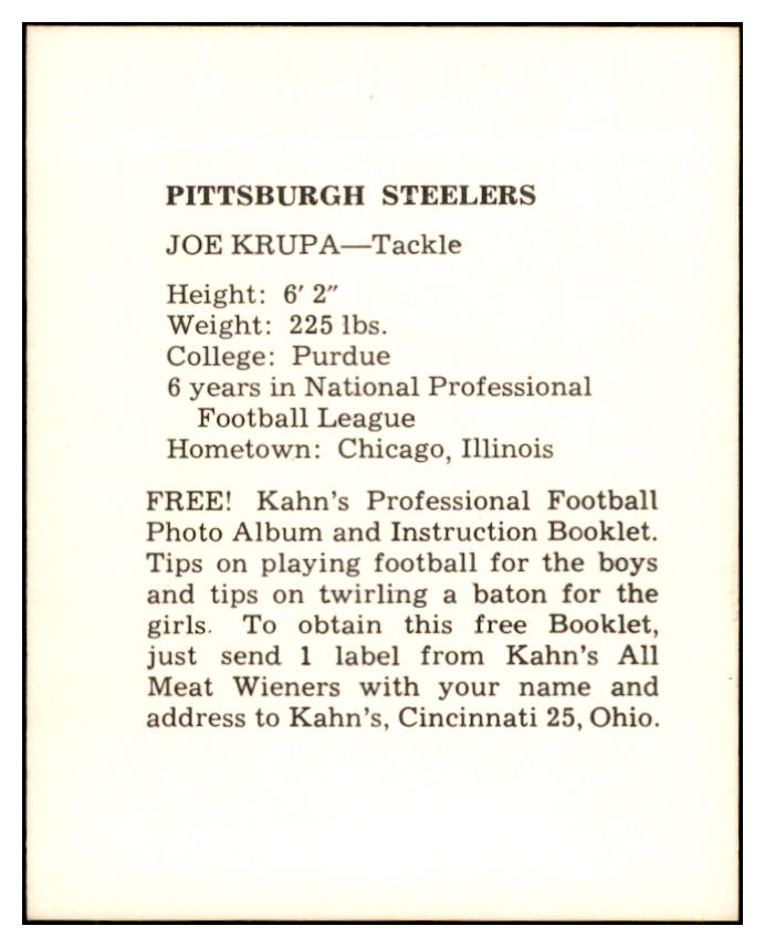 1961 Kahns Football Joe Krupa Steelers NR-MT 537183