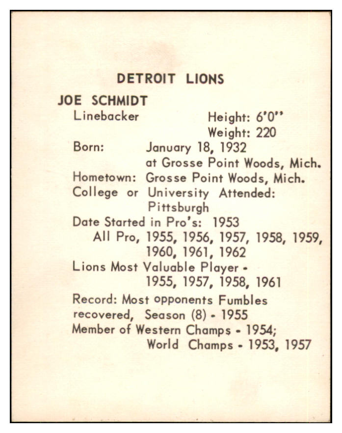 1963 Kahns Football Joe Schmidt Lions NR-MT 537260
