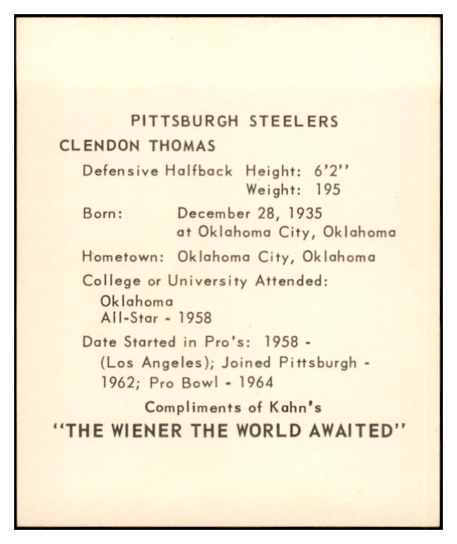 1964 Kahns Football Clendon Thomas Steelers NR-MT 537291