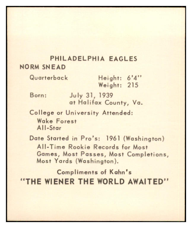1964 Kahns Football Norm Snead Eagles NR-MT 537289