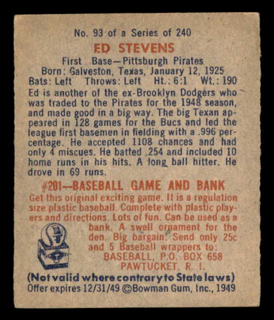 1949 Bowman #093 Ed Stevens Pirates Signed Autographed