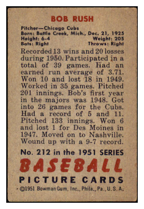 1951 Bowman #212 Bob Rush Cubs Signed Autographed 532065