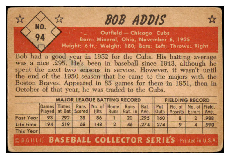 1953 Bowman #094 Bob Addis Cubs Signed Autographed 532101