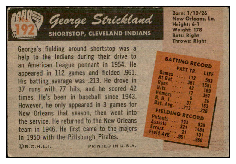 1955 Bowman #192 George Strickland Indians Signed Autographed 534644
