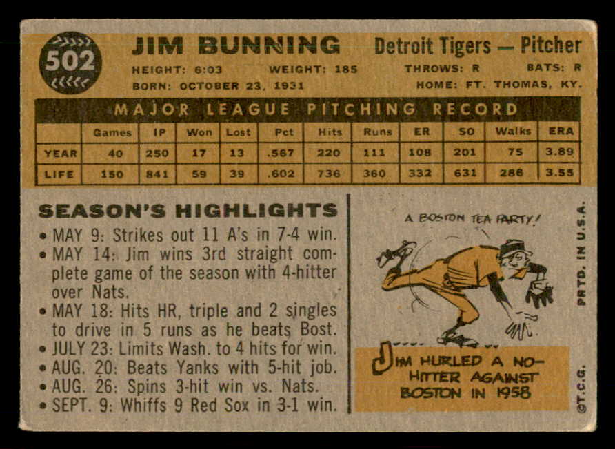 1960 Topps #502 Jim Bunning Tigers Signed Autographed
