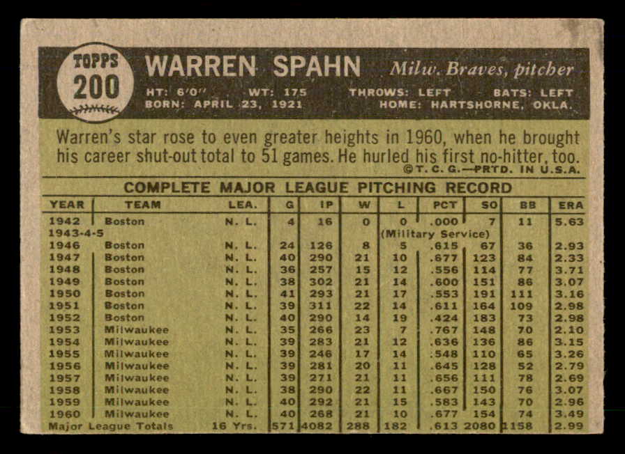 1961 Topps #200 Warren Spahn Braves Signed Autographed