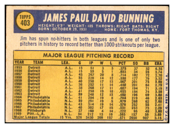 1970 Topps #403 Jim Bunning Phillies Signed Autographed 534577
