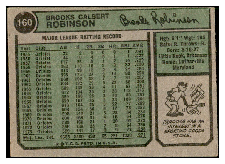 1974 Topps #160 Brooks Robinson Orioles Signed Autographed 534581