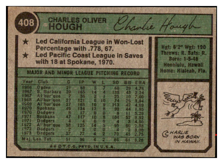 1974 Topps #408 Charlie Hough Dodgers Signed Autographed 531953