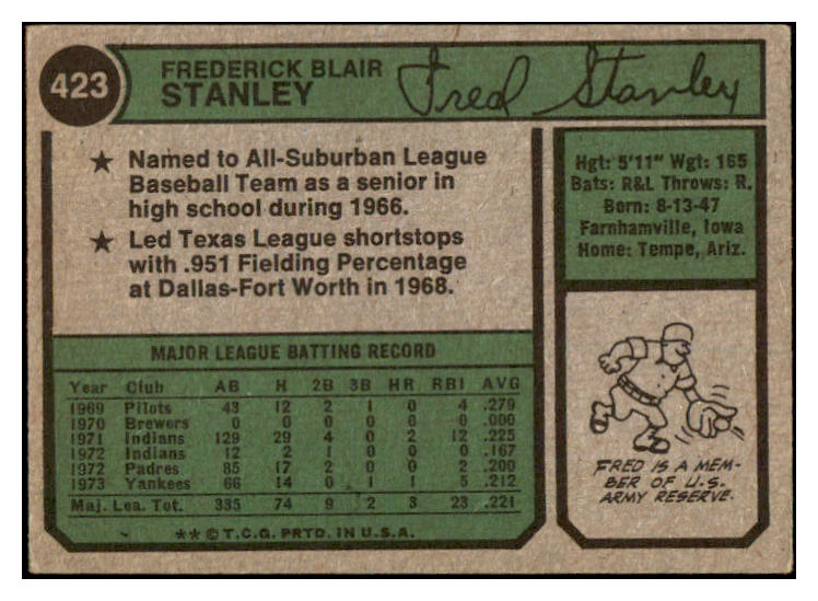1974 Topps #423 Fred Stanley Yankees Signed Autographed 531916