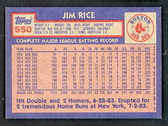 1984 Topps #550 Jim Rice Red Sox Signed Autographed 534578