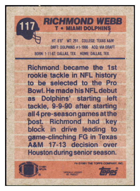 1991 Topps #117 Richmond Webb Dolphins Signed Autographed 532035
