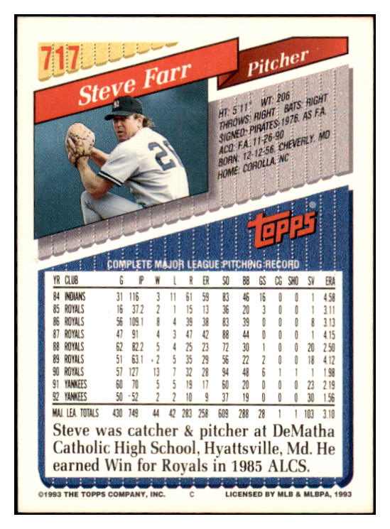 1993 Topps #717 Steve Farr Yankees Signed Autographed 531878