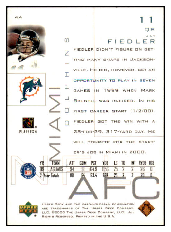 2000 Upper Deck #044 Jay Fiedler Dolphins Signed Autographed 532030