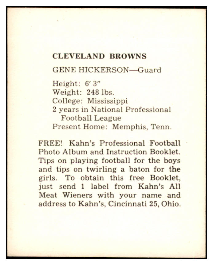 1961 Kahns Football Gene Hickerson Browns NR-MT 537182