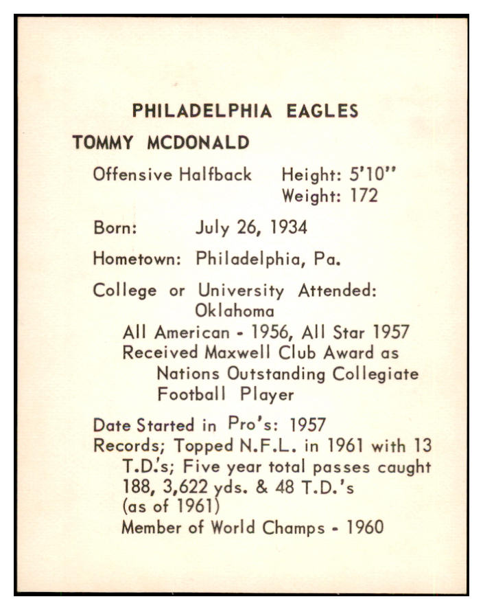 1963 Kahns Football Tommy McDonald Eagles NR-MT 537245