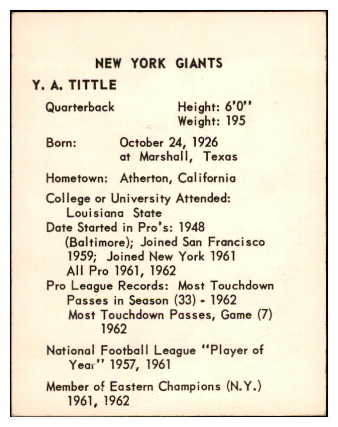 1963 Kahns Football Y.A. Tittle Giants NR-MT 537268