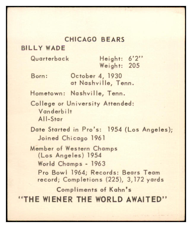 1964 Kahns Football Bill Wade Bears NR-MT 537293