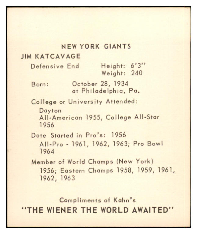 1964 Kahns Football Jim Katcavage Giants NR-MT 537279