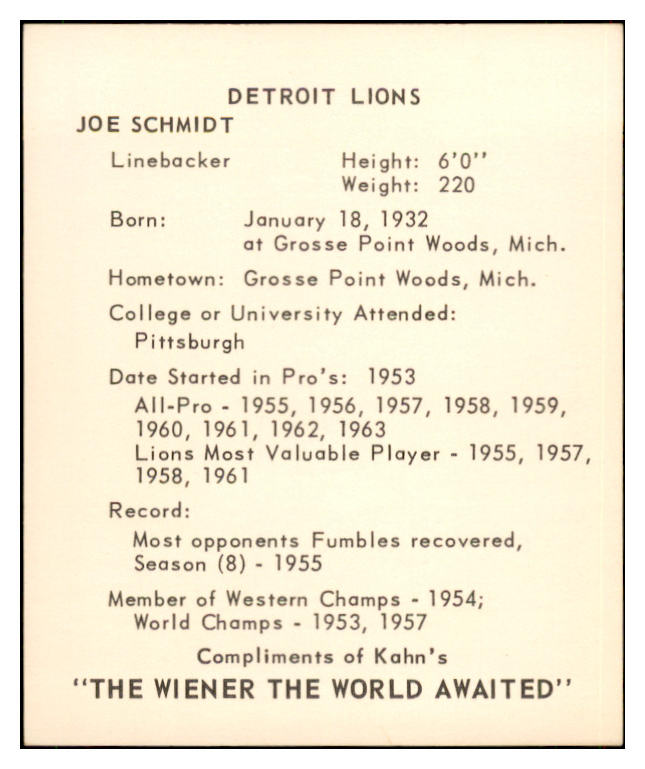 1964 Kahns Football Joe Schmidt Lions NR-MT 537288