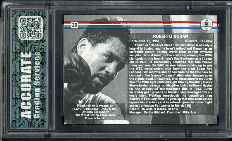 1991 Ringlords #020 Roberto Duran Boxer AGS 10 GEM MINT 534089