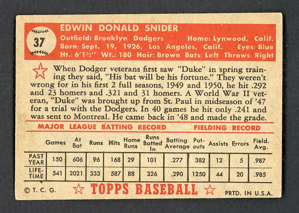 1952 Topps Baseball #037 Duke Snider Dodgers EX Red 546966