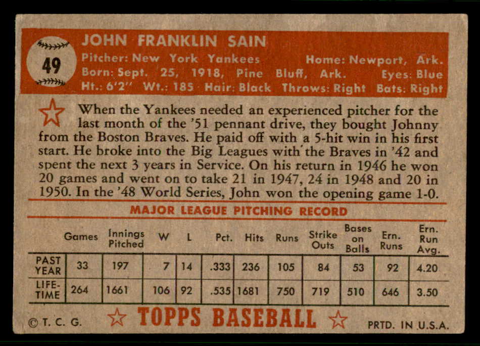 1952 Topps Baseball #049 Johnny Sain Yankees VG Red 541935