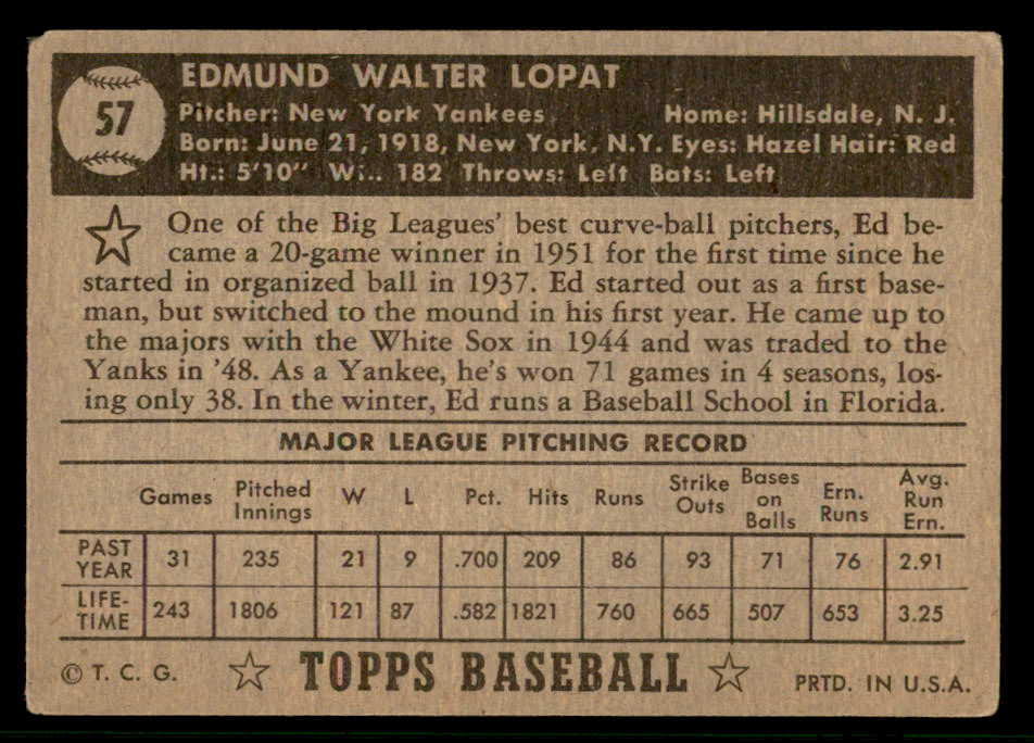 1952 Topps Baseball #057 Eddie Lopat Yankees VG Black 541932