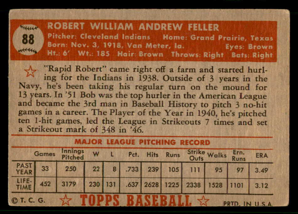1952 Topps Baseball #088 Bob Feller Indians VG 542384
