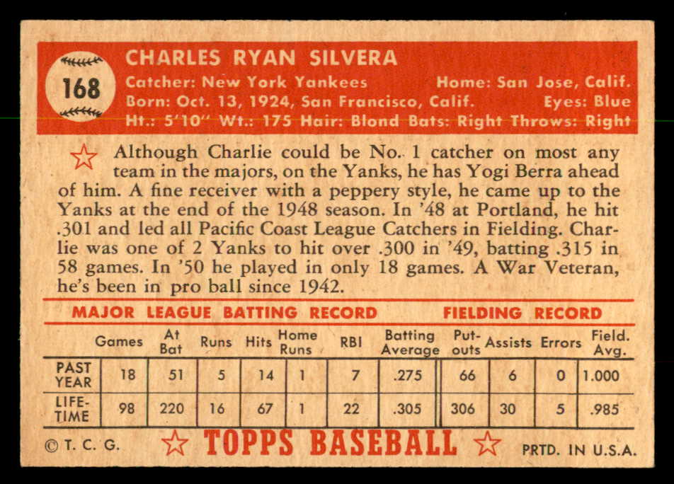 1952 Topps Baseball #168 Charlie Silvera Yankees EX-MT 544242
