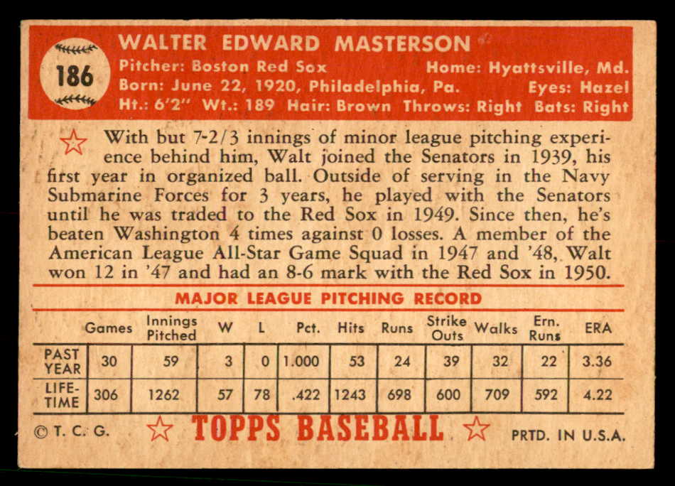 1952 Topps Baseball #186 Walt Masterson Red Sox EX+/EX-MT 544260
