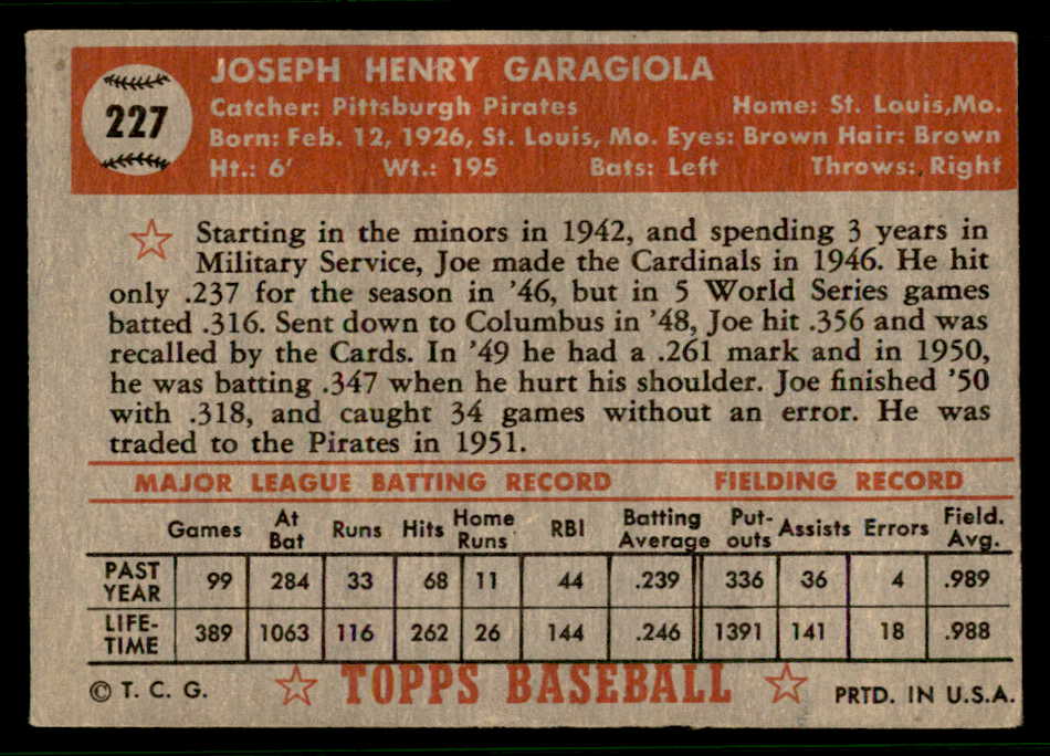 1952 Topps Baseball #227 Joe Gargiola Pirates EX 541834