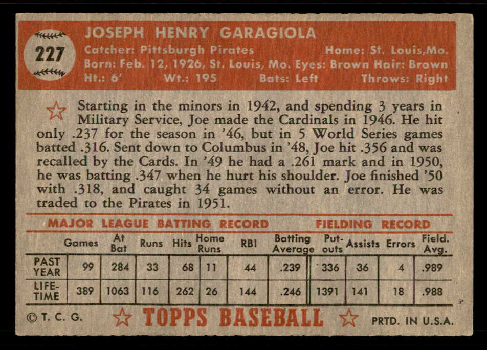 1952 Topps Baseball #227 Joe Gargiola Pirates EX-MT 541876