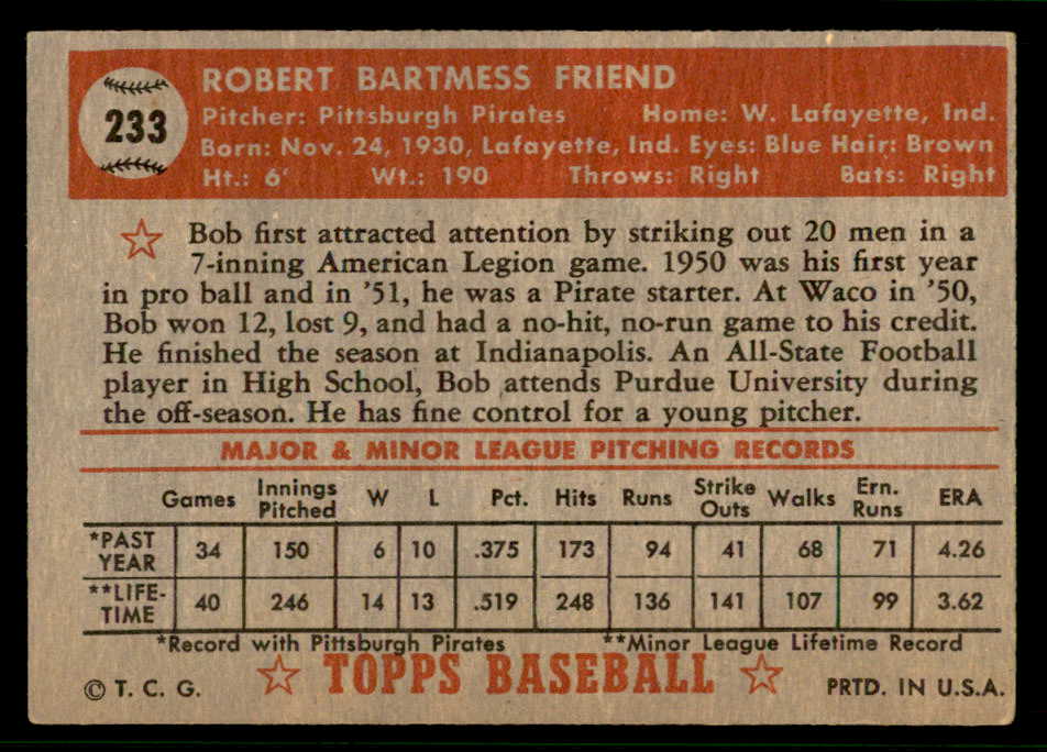 1952 Topps Baseball #233 Bob Friend Pirates EX 541945