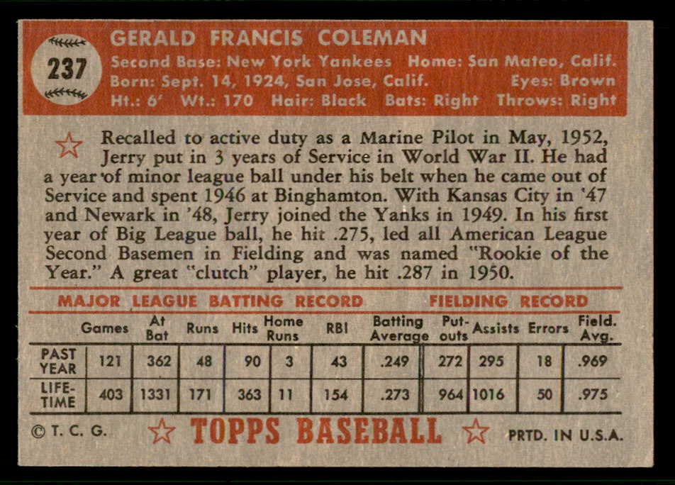 1952 Topps Baseball #237 Jerry Coleman Yankees EX-MT 541948